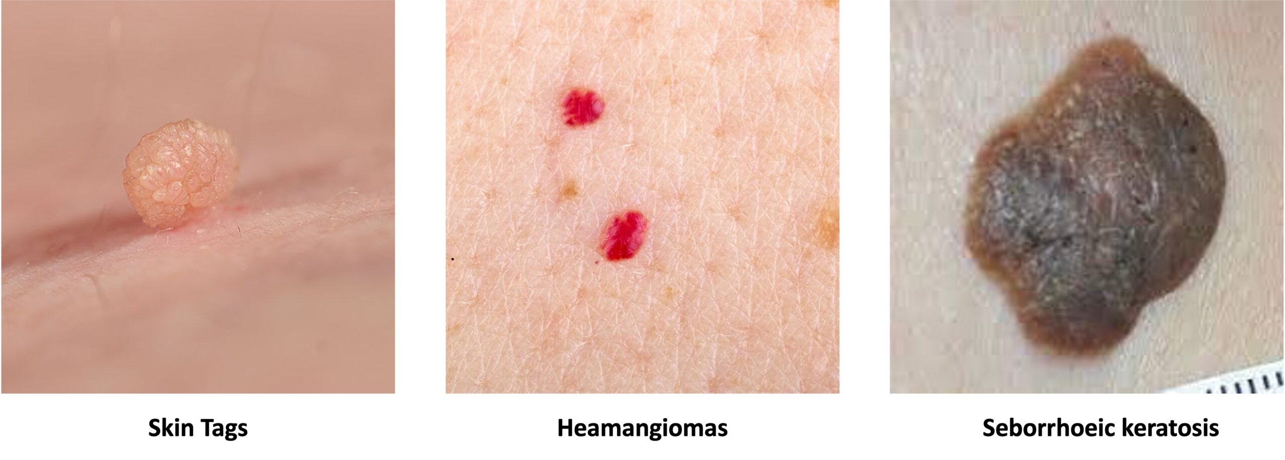 Skin Tags:  Skin tags are small, soft, skin-coloured growths on your skin. They can vary in colour and size – from a few millimetres up to 5cm wide.